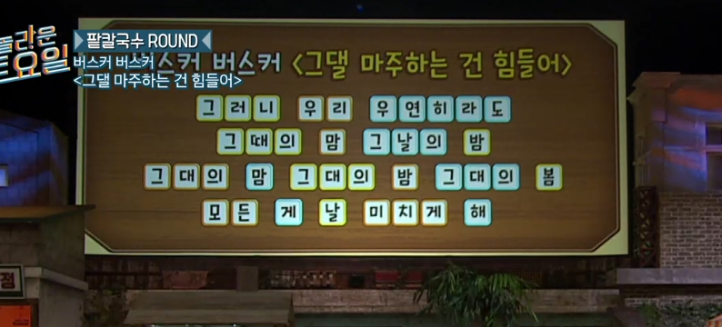 이번 간식 게임은 화면에 드라마, 만화 등 등장인물의 이름이 뜨면 그 인물의 극 중 커플 이름을 맞추면 되는 러브러브 커플 퀴즈로 진행되었습니다. 1등으로 혜리가 드라마 '또! 오해영'의 남자 주인공인 박도경의 상대역 '오해영'을 맞추면서 가장 먼저 매운 어묵을 맛보았습니다.