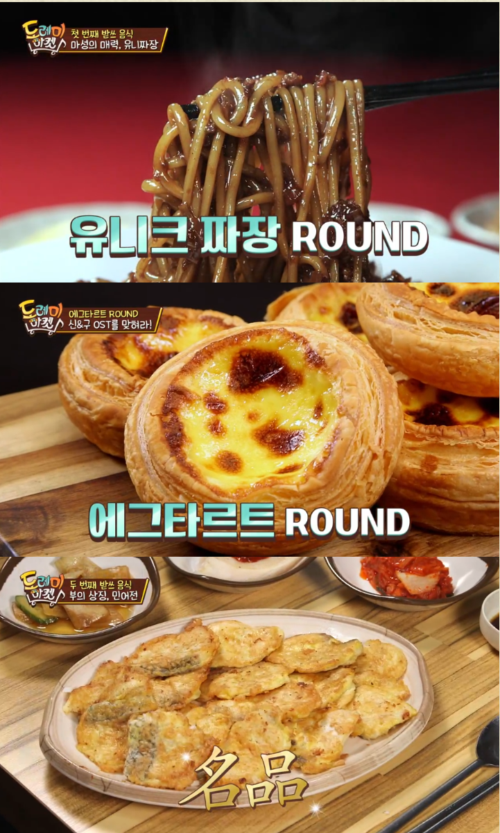 2라운드는 바로 양반가의 보양 음식이자 부의 상징인 민어전이었습니다. 신포 국제시장에서는 민어의 부레를 더욱 풍부하게 먹을 수 있는 곳으로 유명하다고 하는데 이번에는 전으로 선보였습니다. 두툼하게 칼로 저민 민어를 밀가루를 묻히고 계란물에 담근 후 기름에 구워줍니다. 세상에 존재하는 전 중에 가장 고급스러운 전이라고 가히 말할 수 있고 그 담백함이 다른 생성전과는 비교 불가하고 하니 다음에 꼭 먹어봐야겠습니다.